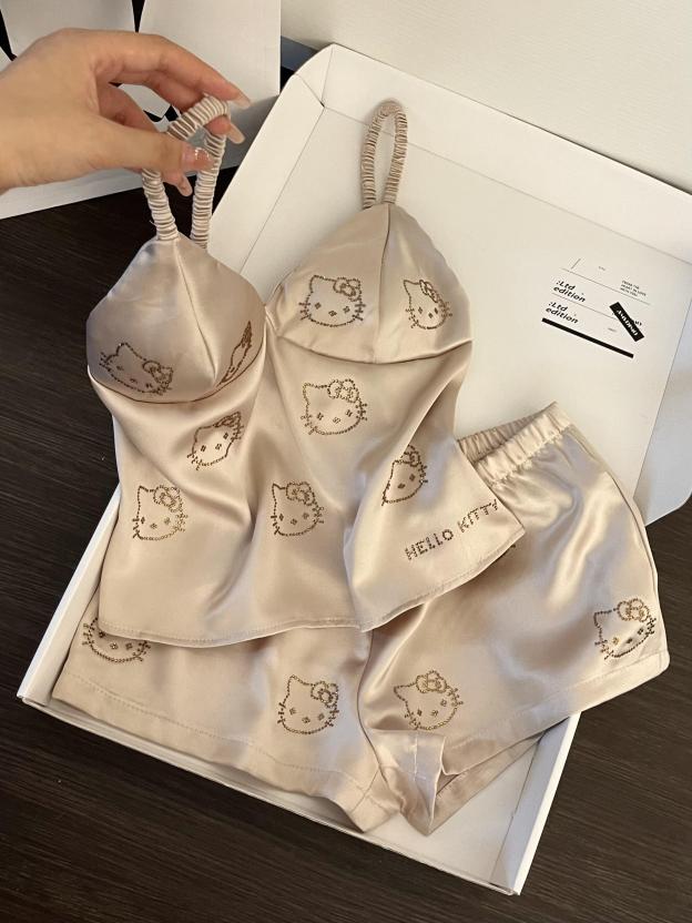 HK Champagne Satin Pajama Set for Women 2 Piece Silky Lingerie Sleepwear Camisole Pj Shorts Set Soft Nightwear