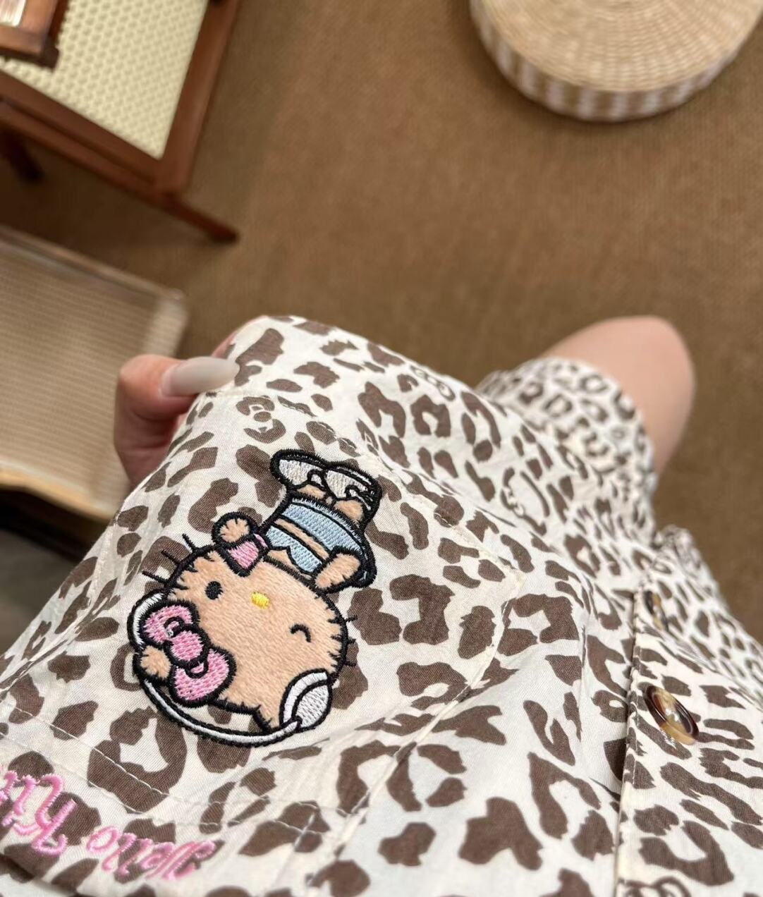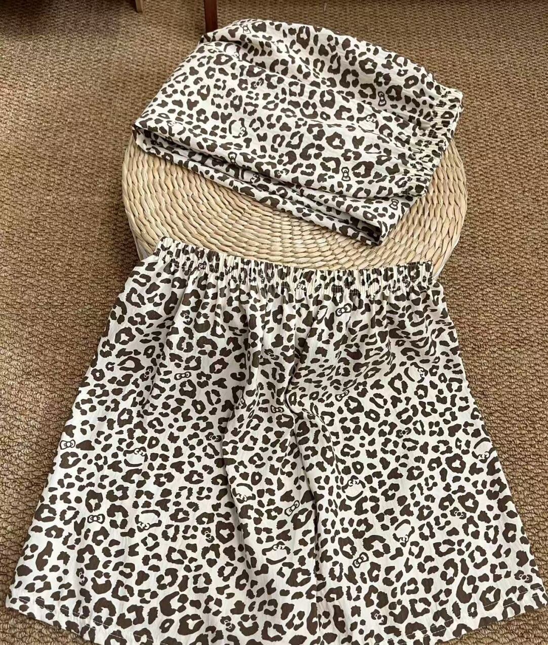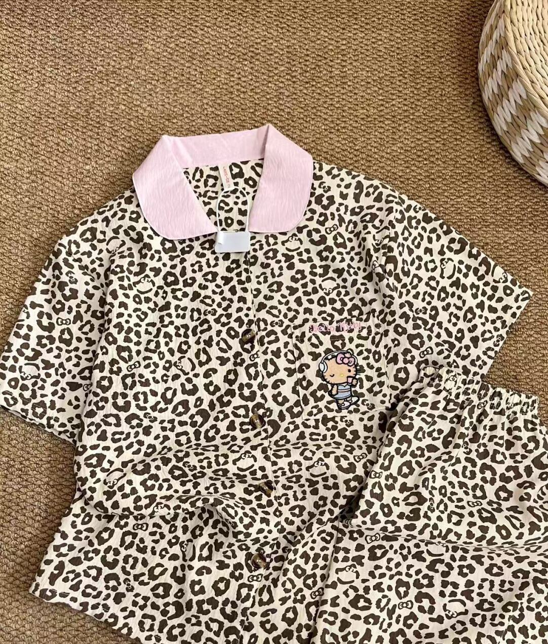 Bring a touch of cuteness and comfort to your nights with thisHello Kitty-inspired leopard print pajama set.Designed for women who love both style and relaxation, this two-piece loungewear set includes a short-sleeve top with a contrast collar and matching shorts.