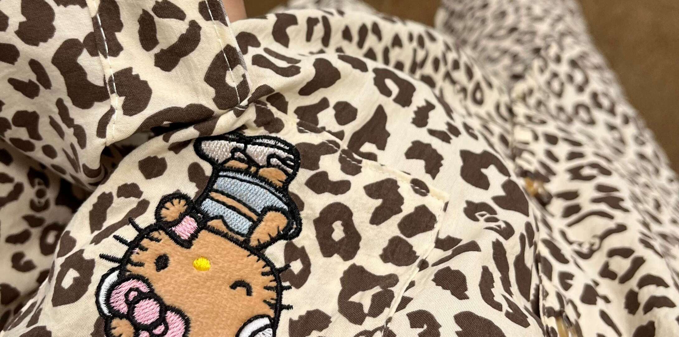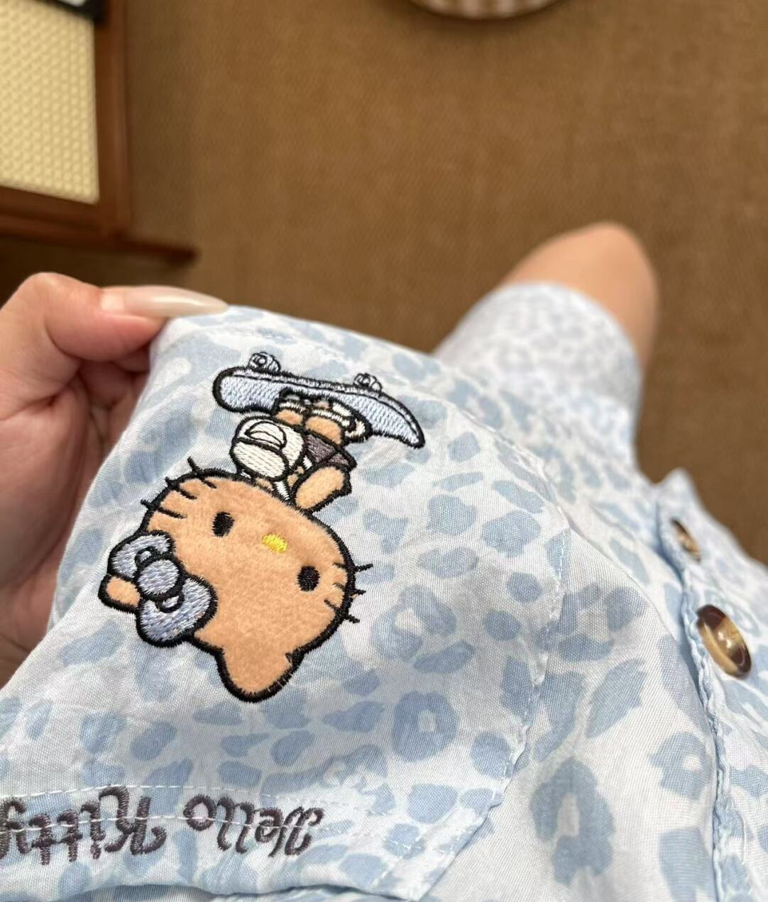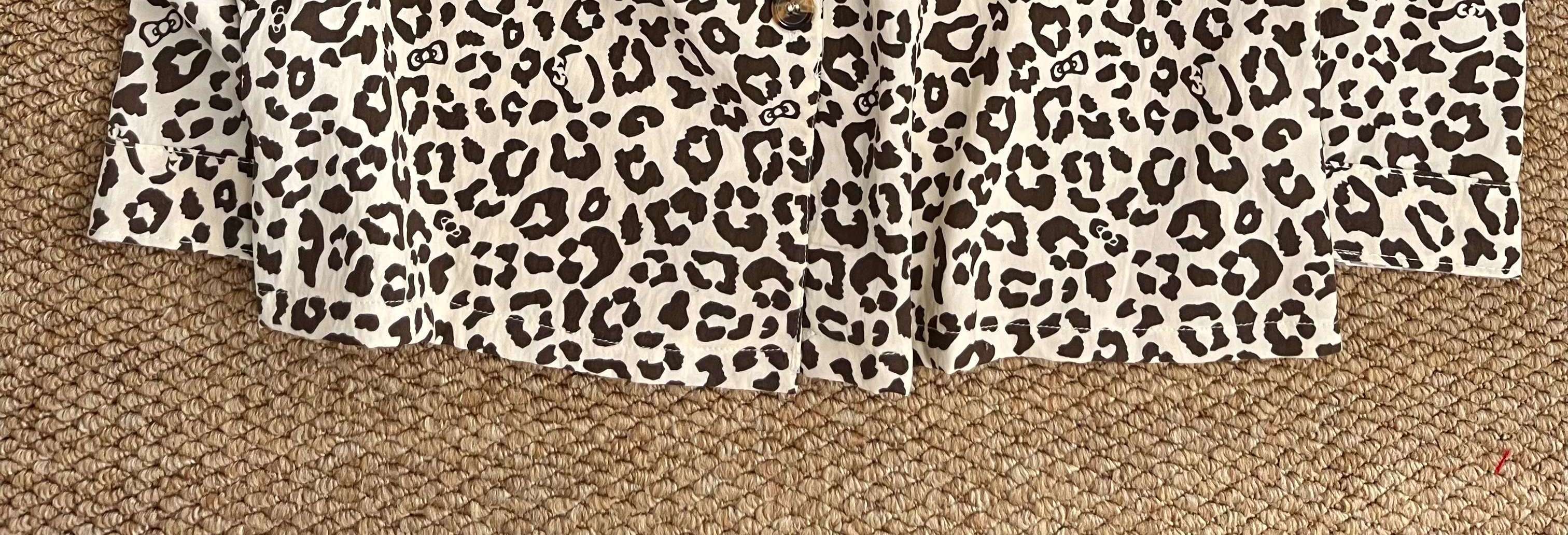 Bring a touch of cuteness and comfort to your nights with thisHello Kitty-inspired leopard print pajama set.Designed for women who love both style and relaxation, this two-piece loungewear set includes a short-sleeve top with a contrast collar and matching shorts.