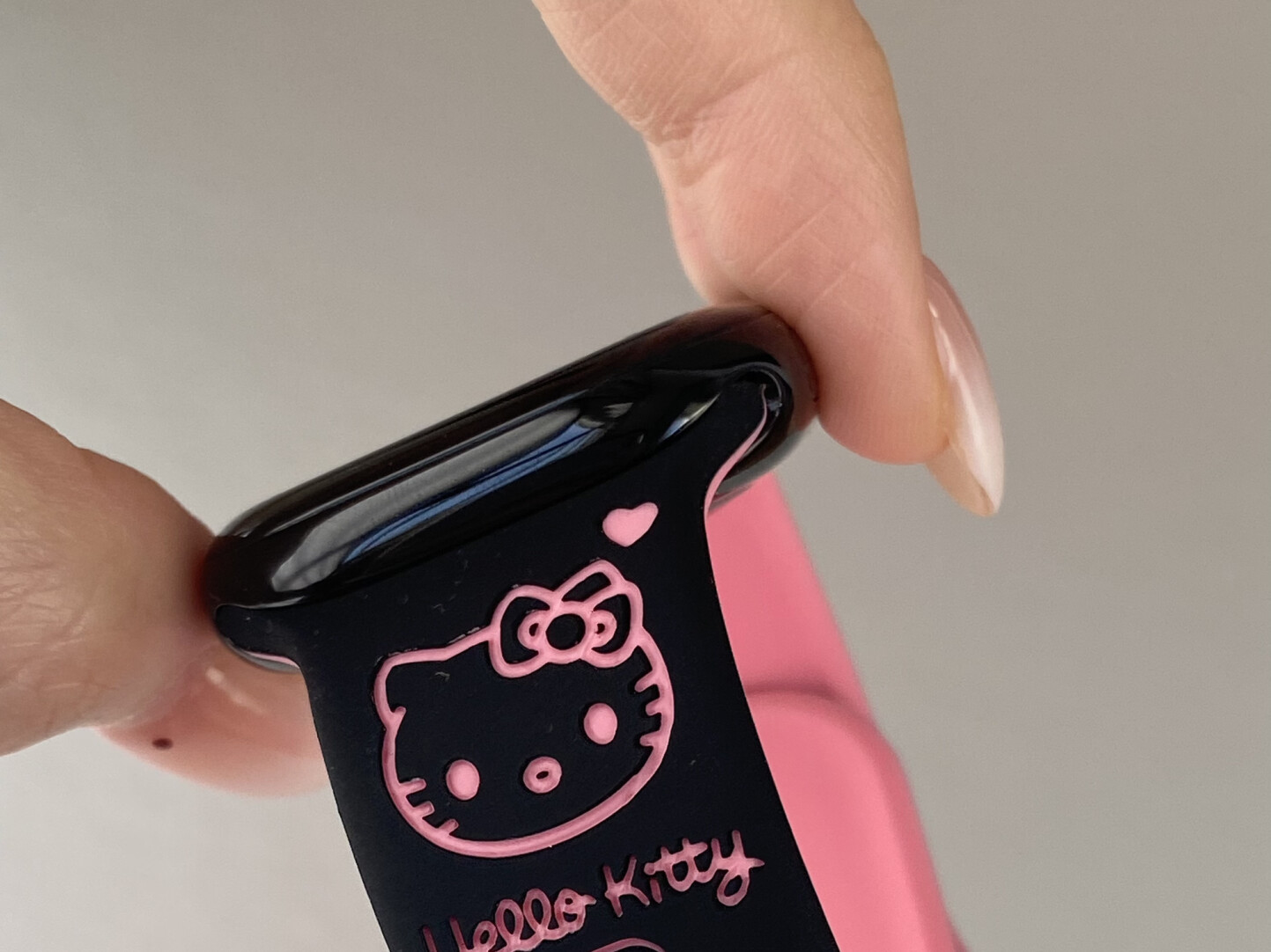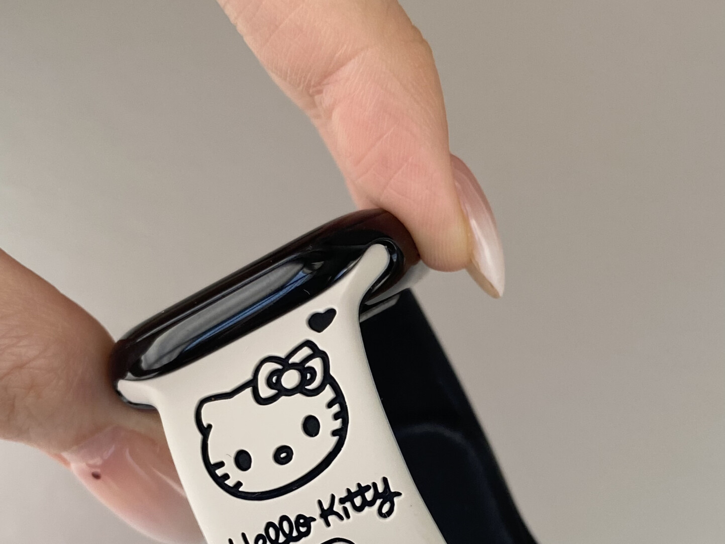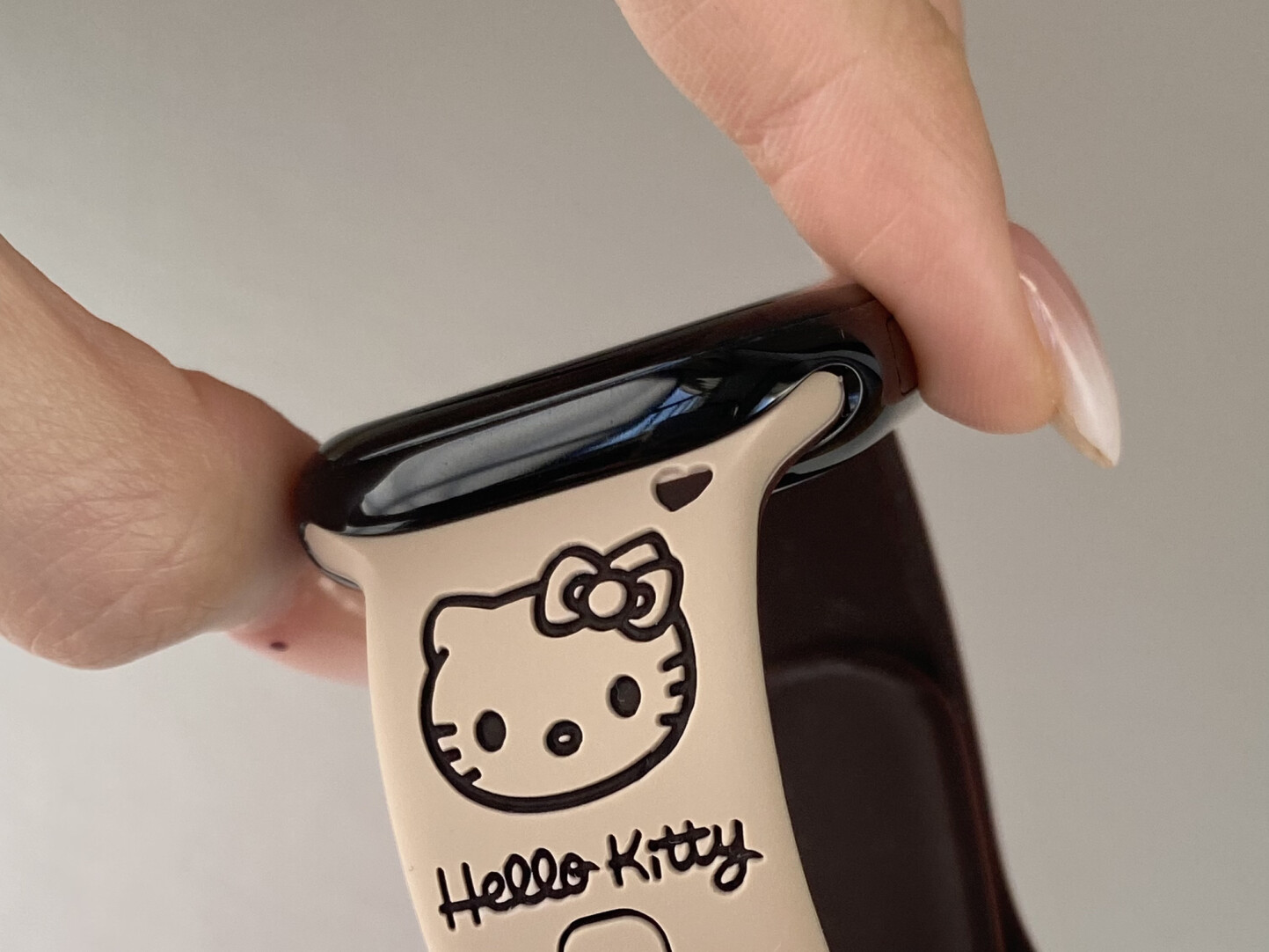 ⌚Kawaii Meets Everyday Function 🐱🎀 Make your Apple Watch stand out with thisHello Kitty engraved silicone band.Designed with a soft, skin-friendly texture and carved with adorable kitty details, this strap combines comfort and cuteness for daily wear.